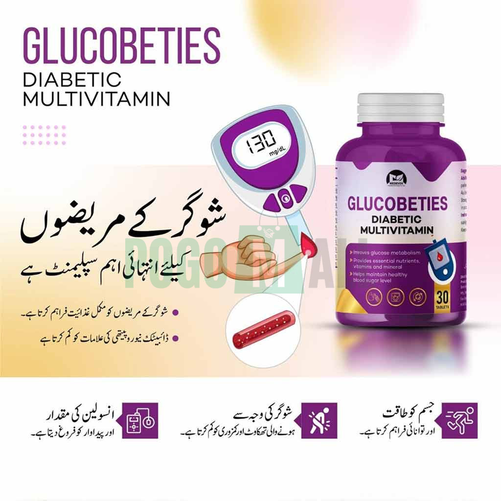 Glucobeties Tablet is a comprehensive nutritional supplement specially formulated for individuals suffering from diabetes, insulin resistance, and related symptoms such as weakness, fatigue, neuropathic pain, and tingling sensations.